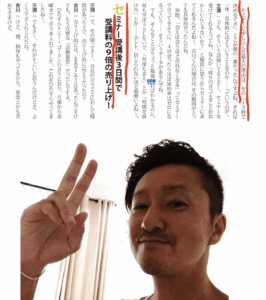 その上で彼は、「セミナー受講後3日間で受講料の9倍の売り上げ!」と言っています。
